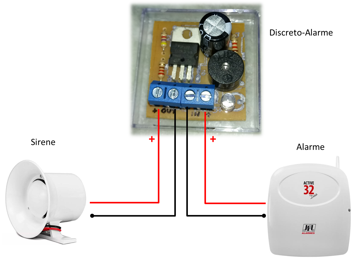 Quando o alarme dispara, o sinal enviado para a sirene é constante, e então o Discreto-Alarme encaminha esse sinal para a sirene, fazendo aquele barulhão que você está acostumado. Aliás, o Discreto-Alarme ajuda a fazer um pouco mais de barulho porque ele toca junto.