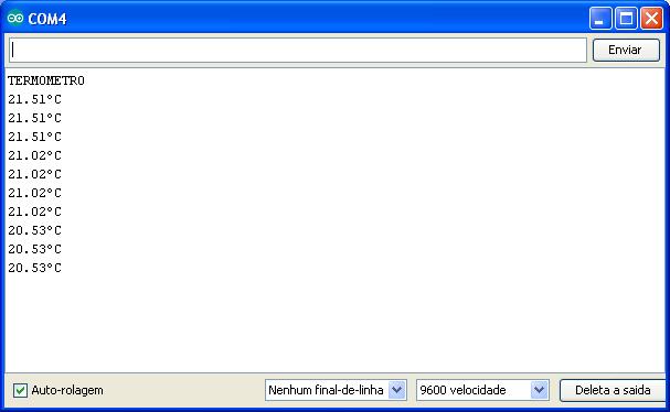 Clique no ícone para gravar no Arduino e abra a ferramenta Serial Monitoring para poder realizar a leitura da informação. A primeira linha da rotina LOOP() faz a leitura da entrada analógica A0, transformando-a em um número de ponto flutuante, que é multiplicado por 5 (pois a máxima tensão é 5V) e dividido por 1023 (pois é o máximo valor possível na entrada). O resultado é dividido por 0,01 referente aos 10mV por grau Celsius.