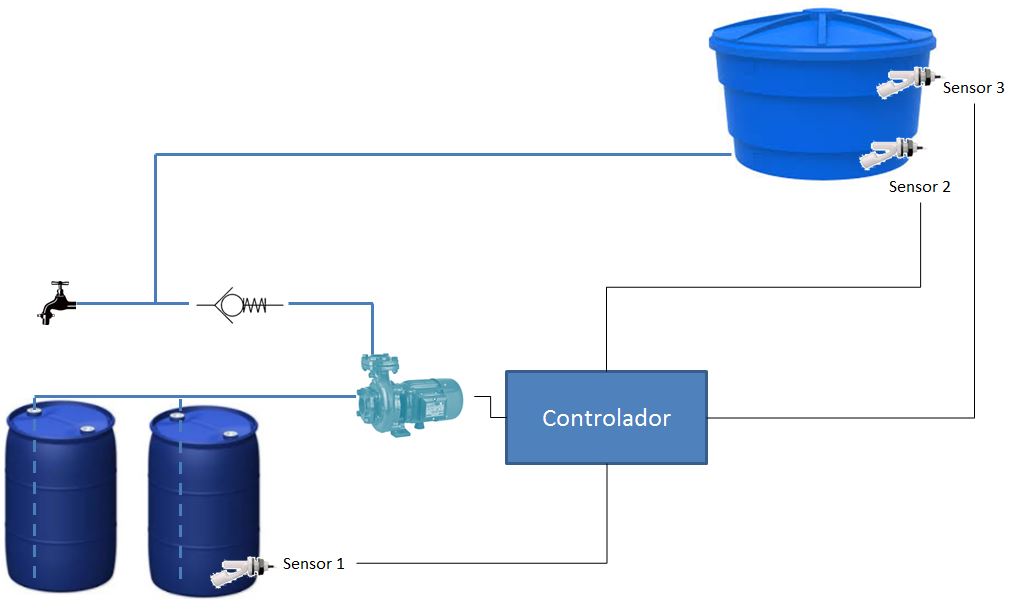 Eu preciso que o bombeamento ocorra na mesma tubulação de saída da caixa d'água. Por isso preciso de um sistema de controle que monitore o nível de água para que não haja falta de água nem transbordamento.