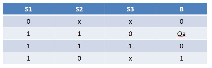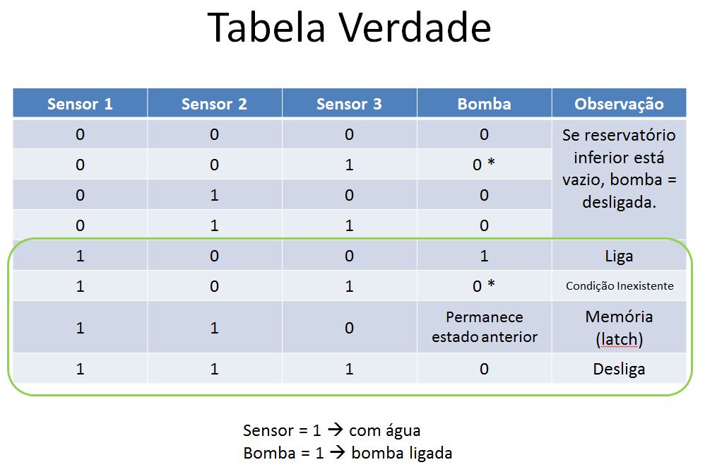 Eu estava lecionando Eletrônica Digital na faculdade Anhanguera da minha cidade e me senti na obrigação de desenvolver o circuito de controle utilizando apenas portas lógicas e latches. Pra quem não se lembra, um Latch é um circuito integrado com a mesma função de um Flip-Flop mas que funciona sem a necessidade de um sinal de Clock para sincronizar suas comutações. Você imagina o motivo de ter que utilizar um Latch? A resposta é que para o funcionamento do controlador, se espera que haja uma condição para iniciar a transferência de água para a caixa, e essa transferência deve se encerrar apenas quando for atingido o limite de água, quando a bomba seria desligada e, do mesmo modo, a bomba permaneceria desligada até que o nível mínimo fosse novamente atingido. Percebeu que a região intermediária da caixa d'água (entre o mínimo e o máximo) precisa permanecer com a bomba ligada SOMENTE SE ela já estiver ligada anteriormente (caixa enchendo) e precisa manter a bomba desligada se ela já estiver desligada anteriormente (caixa esvaziando)? Isso é chamado de Histerese. Então eu preciso de um circuito de memorize o estado anterior da saída até que uma certa condição a faça ser alterada, e um circuito com portas lógicas (combinacional) simples não consegue armazenar uma condição em memória (simplesmente porque não existe memória em um circuito combinacional puro). Então o uso do Latch introduz a condição de memorização da qual preciso, sem a necessidade de empregar sistema microcontrolados para gravar resultados em memórias caras. Abaixo se observa a tabela verdade do circuito controlador necessário: