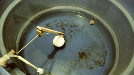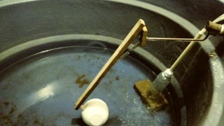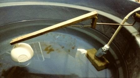 O dispositivo consiste em uma articulação de madeira com a boia em uma das extremidades, a outra extremidade acoplada no braço da boia original, e um conjunto de molas para deixar o braço da válvula sempre fechado. As fotos a seguir mostram seu funcionamento.