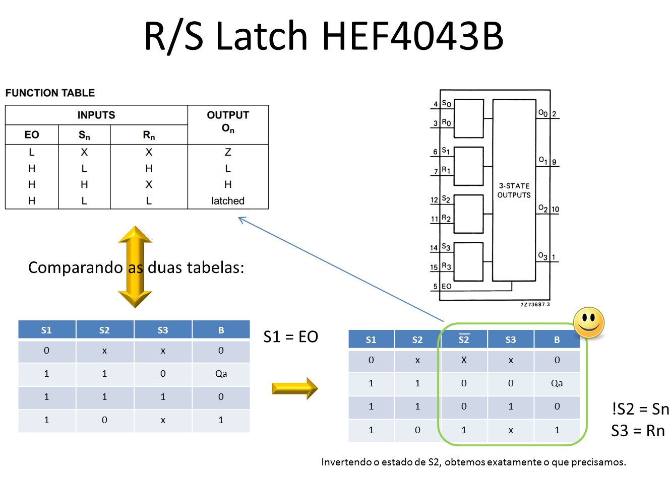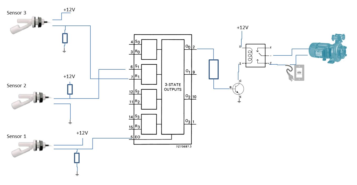 Comecei pesquisando quais os Latches comerciais, e encontrei o HEF4043B, um CI com 4 Latch R/S com saídas 3-state. Fiz então uma comparação entre as duas tabelas verdade e pude verificar que se eu considerar que o sensor 1 fará a habilitação do circuito em EO (pois se não houver água armazenada nos reservatórios inferiores, não se deve acionar a bomba), e se eu inverter o sinal do Sensor 2, obterei exatamente o que preciso para o controle da minha bomba elétrica. E só me custou R$4,50 na Loja do Mário em Taubaté.