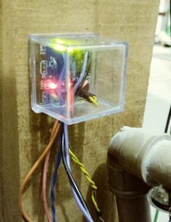 Após essa simulação, foi montado o dispositivo com dois pressostatos para monitorar o nível da água na caixa. Trata-se de uma câmara feita à partir de uma garrafa plástica com o fundo aberto, e em sua tampa foi colado um tubo, do qual derivam duas mangueiras que são conectadas aos dois pressostatos. O conjunto é mantido no fundo da caixa d'água através de um pequeno bloco maciço de concreto. À medida que a água vai subindo, o ar dentro dessa garrafa é pressionado, conduzindo tal pressão pelas mangueiras até os pressostatos que ficam do lado de fora da caixa. Desse modo, não há exposição dos contatos elétricos à umidade presente no interior da caixa, aumentando a vida útil e a confiabilidade do meu sistema. Depois os pressostatos foram regulados: um para nível baixo (o menor nível admitido para então ligar a bomba) e o outro para o nível máximo (aonde se deve desligar a bomba). Importante observar que os pressostatos possuem histerese, um fenômeno que faz com que a pressão de ativação dos contatos não seja a mesma do desligamento desses mesmos contatos.