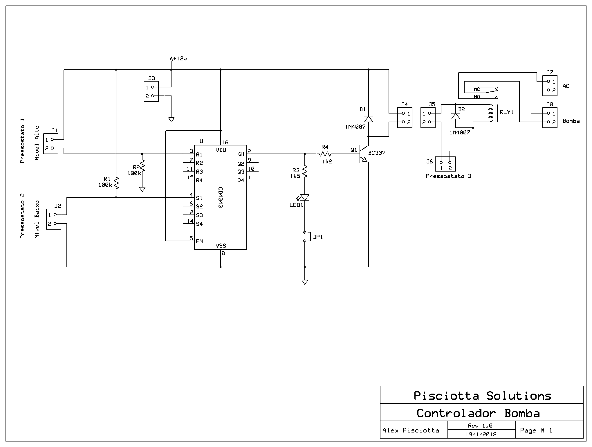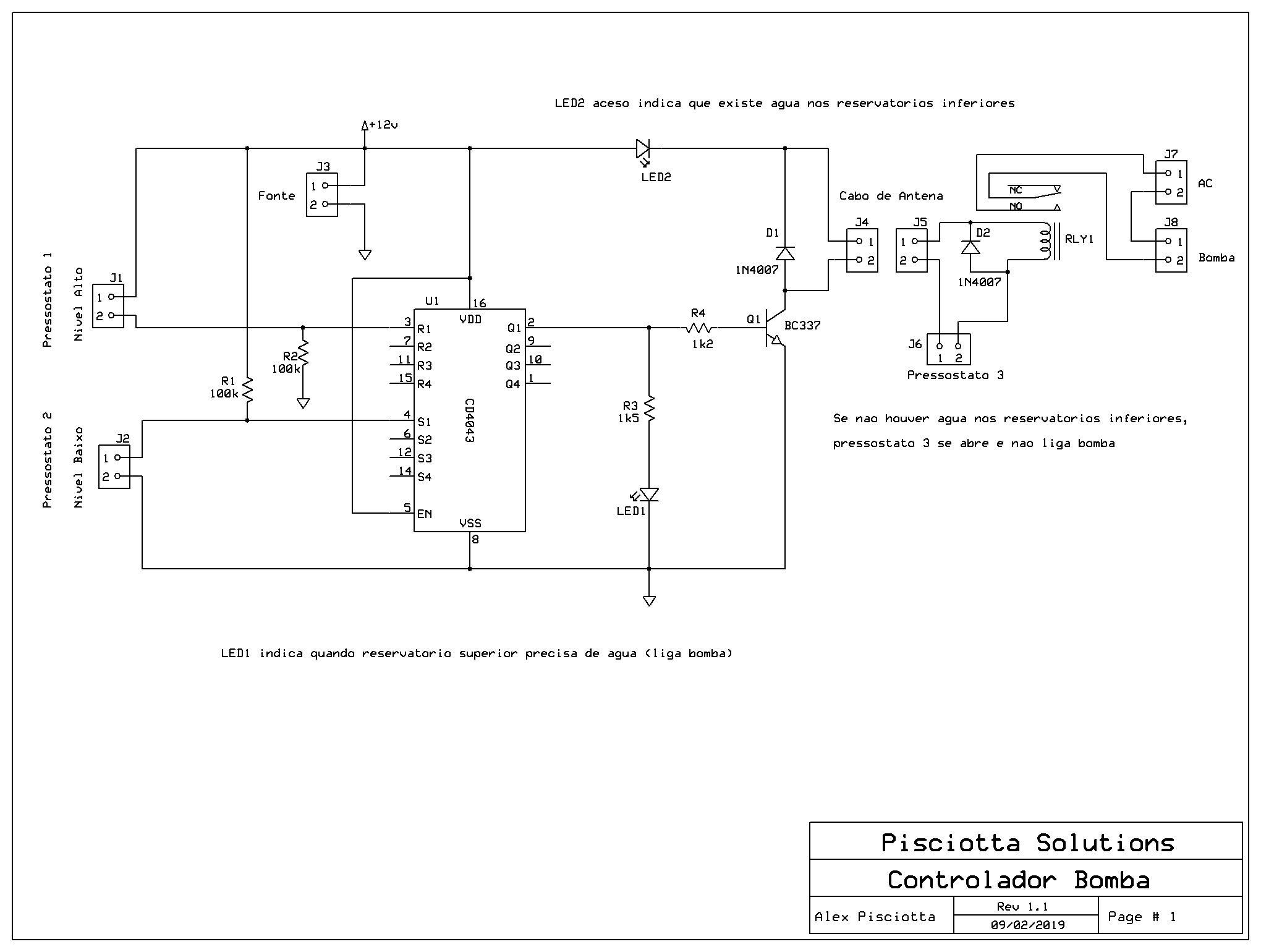 Ao ser energizado, o circuito verifica a condição dos pressostatos que, de acordo com o nível da água, indicam se a bomba precisa ser ligada. A bomba permanece acionada até que o nível de água chegue ao máximo, quando a bomba é desligada, e assim permanece até que o nível fique abaixo do nível mínimo estipulado.