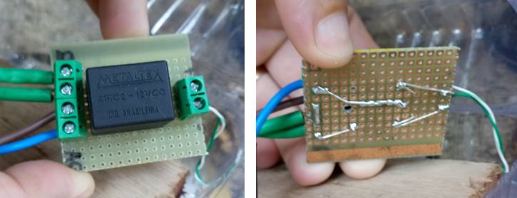 Foi confeccionada a placa de circuito impresso conforme o projeto abaixo. A placa de relè foi montada em PCB matriz padrão, e também é exibida nas figuras abaixo. O sistema foi instalado e os testes indicaram sucesso.
