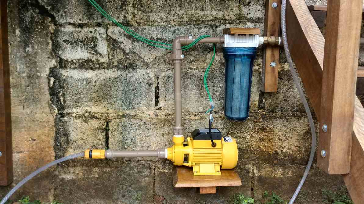Esse circuito ficou guardado por um tempo, pois eu não tinha uma bomba elétrica funcional (até havia ganhado uma de meu cunhado, mas apesar de o motor estar funcionando, a bomba estava muito oxidada e não funcionava). Comprei em outubro de 2017 uma bomba periférica com capacidade de bombear a até 22m de altura, além de um filtro para remover as impurezas da água. Fiz os suportes e o encanamento necessário e já estou aproveitando a água da chuva. Estou construindo o sistema de controle da bomba para deixá-la automática. Já comprei os componentes eletrônicos, e estou trabalhando para instalar os sensores de nível. Não quero fazer furos na minha caixa d'água ou nos tonéis, por isso vou utilizar pressostados retirados de máquinas de lavar, mas tive vazamento no aparato que eu montei inicialmente.