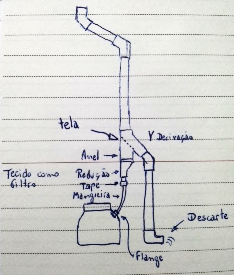 O segundo método de captação da água foi desenvolvido por mim (também não é cópia de nenhum outro projeto existente) e utiliza uma conexão Y (derivação 45º) de PVC, na qual coloquei uma tela de nylon colada conforme o croqui apresentado. Essa tela possui algumas funções: