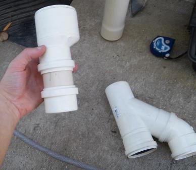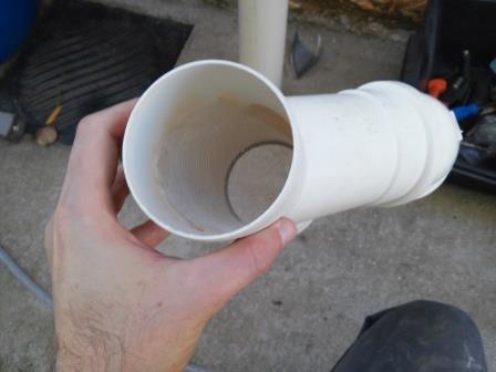 A água vem da calha e entra nesse Y invertido, e encontra uma tela na diagonal, que leva qualquer resíduo sólido para o cano de descarte junto com um mínimo de água, enquanto a maior parte da água continua seu percurso na vertical, chegando a um redutor que possui tecido (pedaços de panos) em seu interior para conter resíduos menores que eventualmente passem pela primeira tela. Portanto a água passa por duas etapas de filtragem. Essa redução possui um tape (uma tampa) com um orifício no centro de onde sai uma mangueira que leva a água até o reservatório. Eu decidi deixar uma mangueira de 1" para facilitar a manutenção dos reservatórios, pois com uma mangueira flexível é fácil movimentar os tanques vazios.
