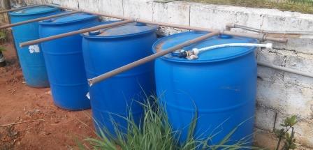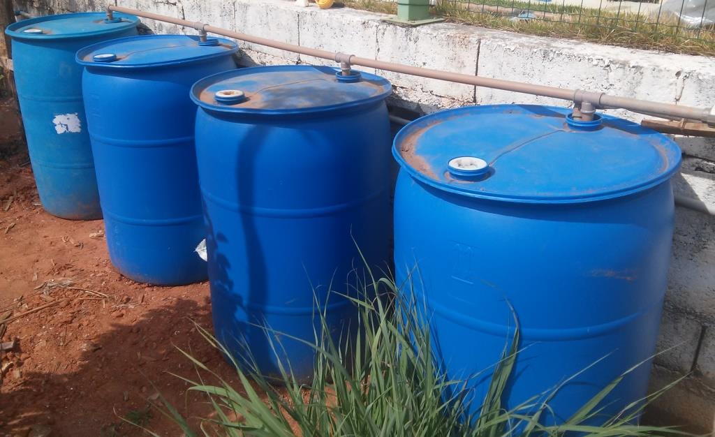 Inicialmente adquiri dois recipientes de material de limpeza (conhecidos como tonéis ou bombonas), sendo um de 100 litros com boca larga e um de 200 litros com duas bocas estreitas com tampa rosqueável; assim eu poderia analisar os prós e contras de cada um. O custo/benefício do recipiente de 200l é muito maior do ponto de vista do armazenamento, porém o de 100l se mostrou muito bom para permitir a retirada de água utilizando um balde devido à boca larga - muito útil quando se deseja lavar o quintal. Então defini que a situação ideal é interligar diversos recipientes de 200l e ao menos um recipiente de 100l para facilitar o uso da água em caso de pane na futura bomba de água.