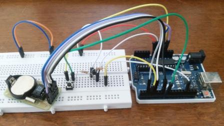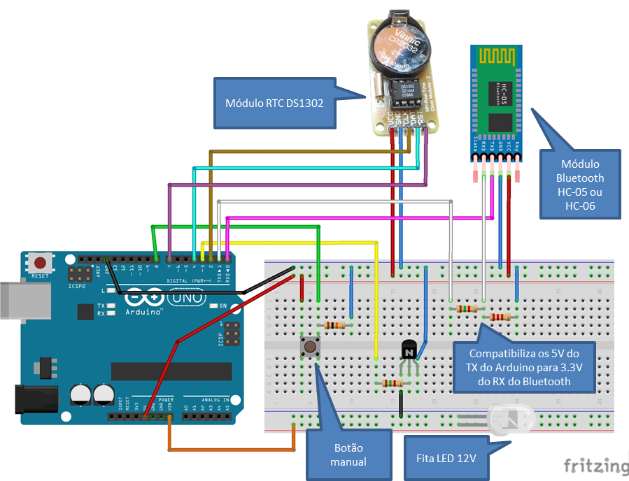 Para o protótipo utilizo um Arduino/Genuino UNO, um RTC ("Real Time Clock" ou Relógio de Tempo Real) DS1302 com bateria, um transistor BC337, um botão "push-bottom" e dois resistores, como pode ser observado na foto e no esquema abaixo.