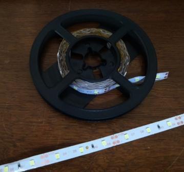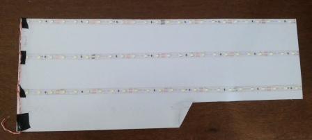 A luminária em si foi construída com 3 tiras de Fita LED Branco (dessas fitas de LED vendidas em rolo de 5m) fixadas em uma superfície retangular (ou quase) de PVC, e soldando as fiações elétricas para a alimentação. No meu caso, esse conjunto solicita uma corrente de apenas 220mA, facilmente suportada pelo transistor BC337. Esse transistor compatibiliza a tensão de alimentação dos LEDs (12V) aos 5V de saída do microcontrolador. A placa de PVC possui um recuo em um dos lados para não interferir no equipamento de filtragem e aquecimento.